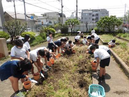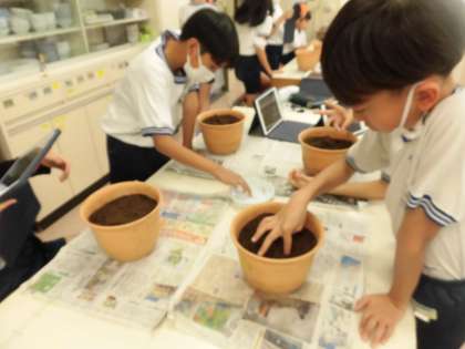 昨年の6年生が育てて収穫したオーガニックコットンの種を植えました。子供たちは、コットンの種を初めて見る子がほとんどで、「これが綿になるの?」「コットンボールたくさん取りたいな」とつぶやきながら、土を鉢に入れ、1人が5粒ずつ種をまきました。無事に発芽することを願いながら、丁寧にまいていました。自分の衣食住の生産現場から遠くにいる現代。生産体験から何を考えることができるか楽しみです。昨年の6年生がたくさんの種を収穫してくれたので、家で育てることができる方はお申し出ください(何年生でもかまいません)