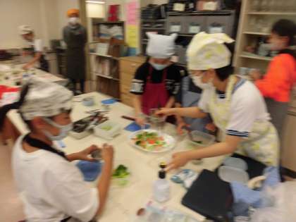 5年生2回目の調理実習は、人参・ブロッコリー・キャベツの三色ゆで野菜サラダです。野菜の種類に応じて切り方やゆで方、調理の手順を学びました。人参は水からゆで、ブロッコリーとキャベツは沸騰した湯でゆでます。キャベツだけはゆでてから切ります。フレンチ・和風・中華風の3つから各自の好みで選んで、ドレッシングを作ります。「野菜サラダと聞いて『いやだな』と思ったけど、おいしくて全部食べた」や「ドレッシングは買うものだと思ってた。今日は中華風にしたけど、家で和風とフレンチも作ってみたい」などの感想がありました。家でもゆで野菜サラダと自家製ドレッシングを作って、学びを生かしてほしいです。