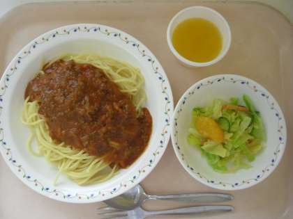 <スパゲティミートソース・フレンチサラダ・みかんゼリー・牛乳>