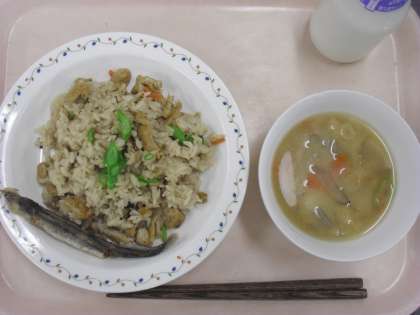 <子ぎつねごはん・ししゃものから揚げ・呉汁・牛乳>
