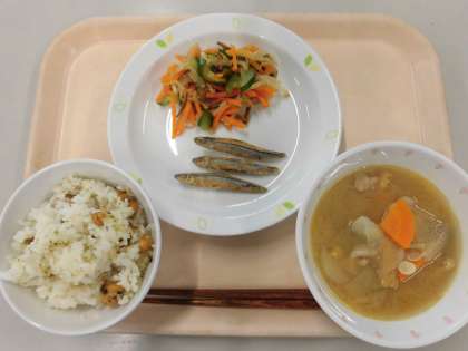 今日の献立は、6月4日の虫歯予防デーにちなんだメニューです。虫歯の予防には、食後の歯磨きも重要ですが、よくかんで食べることも虫歯の予防につながります。よくかんで食べることを意識できるように、かみごたえのある「するめ」や固めにゆでた「大豆」、カルシウム満点の小魚を取り入れた献立にしました。