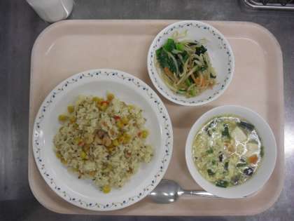 今日のナシゴレンは、トムヤンペーストやナンプラーなどが入ったアジア風の炒めごはんです。ピーマンや赤ピーマン、そしてコーンが入って色取りがよいです。そして、今日のにらたまスープとナムルは、6年生のリクエストにあがっていました。