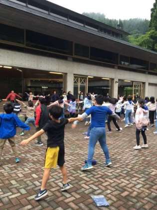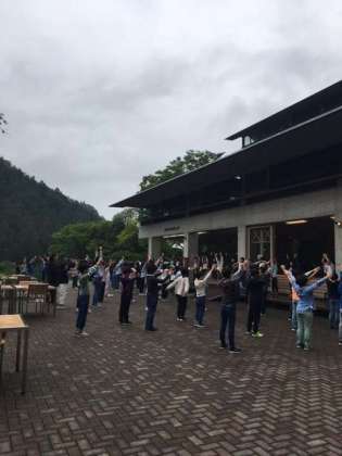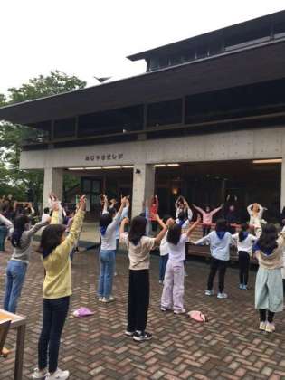 朝会でラジオ体操をしています。今日は予報通りの雨雲が広がっています。みんな元気です。