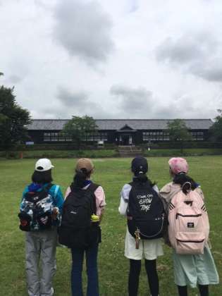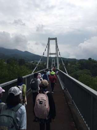 村めぐり その3 少し陽が差すくらいで気温も上がってきました。このまま雨は降らないと判断して、カッパなどは途中で脱いで歩くことにしました。天候に恵まれた移動教室となりました。大きな吊り橋を渡っています。