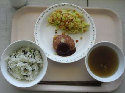 <わかめとじゃこのごはん・アップルチーズハンバーグ・シーザースサラダ・コンソメスープ・牛乳>