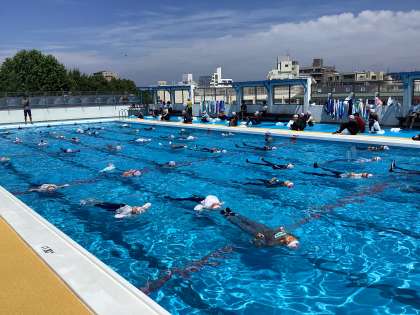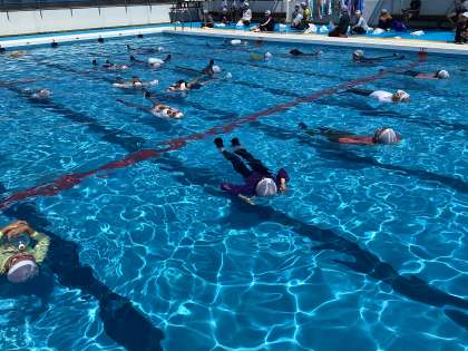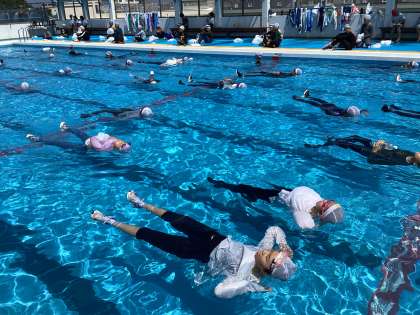 本校では時間を分けて、全学年が着衣泳を行いました。洋服や靴をはいたまま浮かぶ方法を考えたり、ペットボトルを使って浮いたりしました。