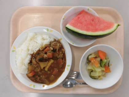 給食も今日で最後になりました。最終日は旬の食材をたくさん使用した献立で、カレーライスには、なすやズッキーニ、かぼちゃなどの夏野菜を入れ、デザートはすいかにしました。
