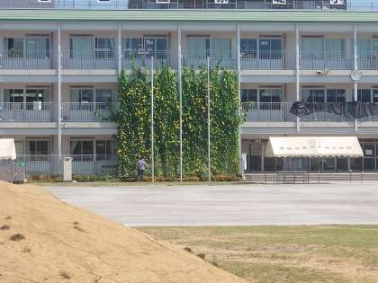 環境美化委員会のみなさんが中心になって、たくさんの人が水やりを手伝ってくれていたマリーゴールドは、夏休み中は校長先生や日直の先生が水やりをしています。グリーンカーテンの下にオレンジ色がとても鮮やかで素敵です。