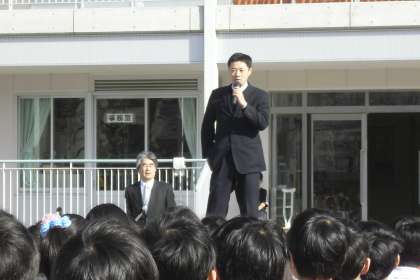 今年度最後の全校朝会は、5年3組の國長教諭の話でした。