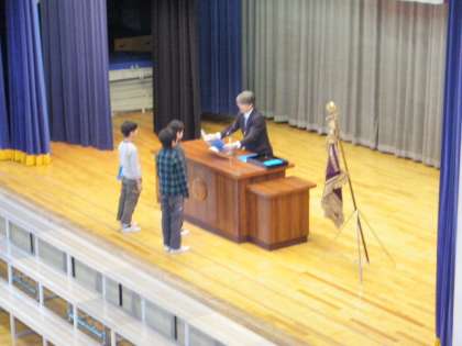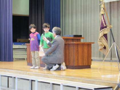 各学級の代表児童に修了証を渡しました。それぞれ新しい学年でしっかり頑張ってほしいと思います。続いて、皆勤賞の表彰を行いました。皆勤児童はその場に立ち、みんなから祝福を受けました。実に70人の児童が欠席0でした。児童代表の言葉は、1学年の2名が行いました。それぞれしっかりした話し方で発表することができました。