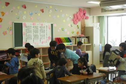 登校してきた1年生の教室での授業のしたくの世話する6年生は、とても優しく接しています。