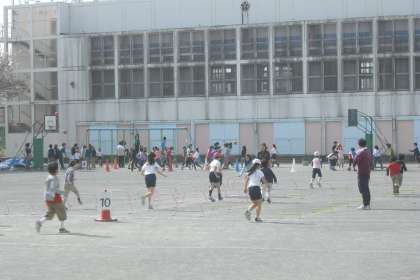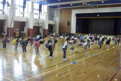 サーキットトレーニングを、3年生から6年生まで校庭で行いました。体育館では、2年生が基本の運動となる体ならしを行いました。
