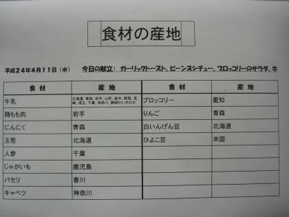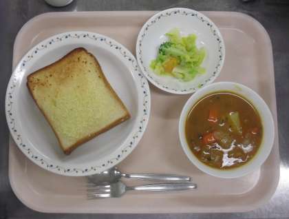 <ガーリックトースト、ビーンズシチュー、ブロッコリーのサラダ、牛乳>