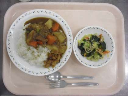 <カレーライス、福神漬、わかめサラダ、牛乳>