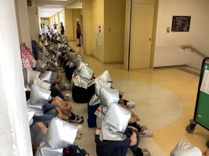 避難訓練を行いました。昨日の雨で校庭が使えなかったため、廊下に避難しています。