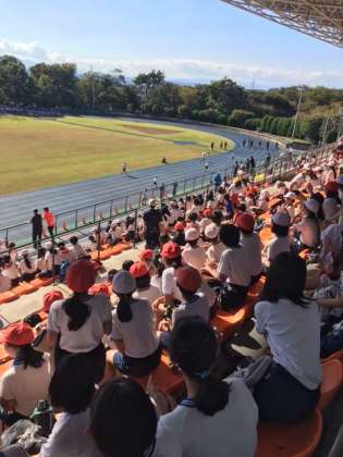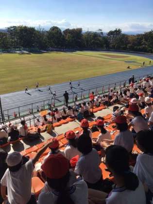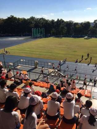 男子の競技中。スタンド前を駆け抜ける友達に力一杯の声援をしています。
