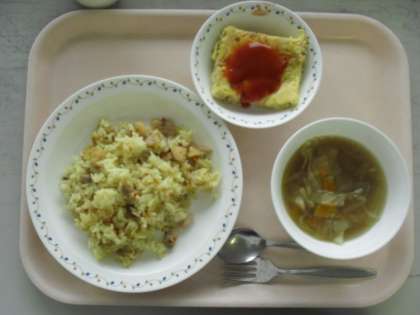 <パエリア、スペイン風オムレツ、キャベツスープ、牛乳>