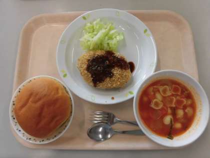 今日は図書館とのコラボメニューです。「11ぴきのねことあほうどり」という本よりお話の中で11ぴきのねこたちはコロッケ屋さんを開いています。そこで今日は給食用にアレンジをして『ツナカレーコロッケ』を作りました。