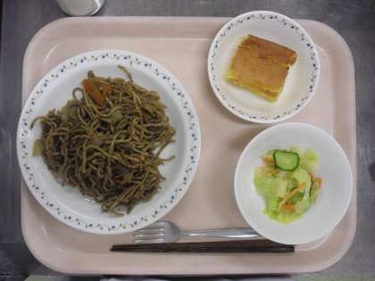 <ソース焼きそば、野菜の甘酢かけ、キャロットケーキ、牛乳>