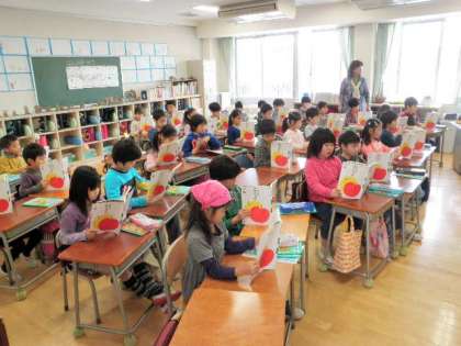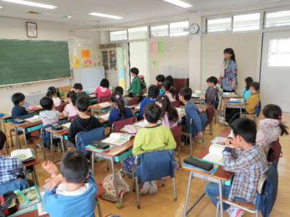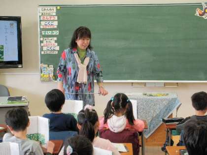 今日の授業は「たろうのともだち」でした。田中先生は、学習スタンダードについて、その都度優しくほめたり注意したりしていました。先生の声は決して大きくないのですが、子どもたちはとてもよく聞いて授業に取り組んでいました。