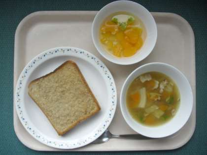 <胚芽セサミトースト、白いんげん豆の田舎風スープ、フルーツポンチ、牛乳>