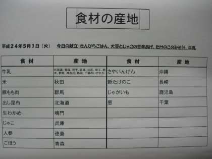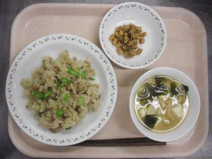<きんぴらごはん・大豆とじゃこの甘辛あげ・たけのこのみそ汁、牛乳>