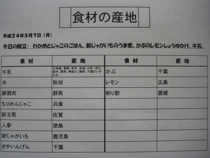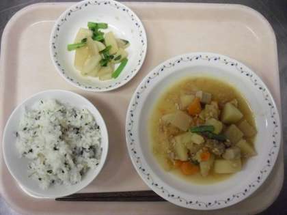 新じゃがいものうま煮は、旬の新じゃがいも、新玉葱、さやいんげん、そして人参、こんにゃく、凍り豆腐、がんもどき、豚肩肉が入ったおいしい煮物でした。わかめとじゃこのごはんは、子どもたちの好きなごはんです。かぶのレモンしょうゆかけは、かぶの葉も使って食べました。