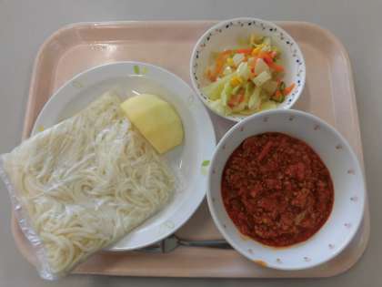 今日の給食は昭和40年ころから登場した「ソフト麵」です。パン以外の主食として登場した「ソフト麺」はうどんのつゆやミートソース、カレーあんかけなどいろいろな味で食べられていたそうです。