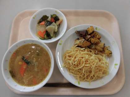 今日は久しぶりのラーメンです。給食のラーメンスープは、ラーメン屋さんのように鶏ガラと豚骨を使ってしっかりとだしをとっています。また赤みそと白みそ、2種類のみそを混ぜたり、給食なので、スープの中にたっぷり具材も入れてあります。