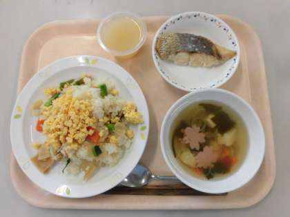 今日は一足早く3月3日の「ひなまつり」にちなんだお祝い献立です。主食の『ちらしずし』は菜の花や炒り卵をちらして色鮮やかに飾り付け、魚はお祝いの席などで食べられる「たい」を塩焼きにしました。デザートはももゼリーです。