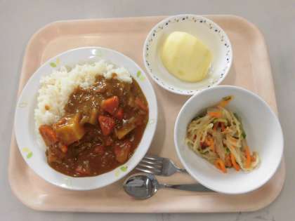6年生のリクエスト献立3日目になります。今日は主食部門1位の発表ですが、投票数が同じ料理が2つありました。今日はその一つ『カレーライス』です。給食の『カレーライス』は、たくさんの具材をじっくり煮込んで作るため、うまみもたくさん出ておいしく出来上がりますが、その他にも甘みが出るまでじっくり炒めた玉ねぎや香ばしくしっかり色付けした特製のカレールーなどおいしくするため、工夫をしています。