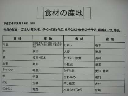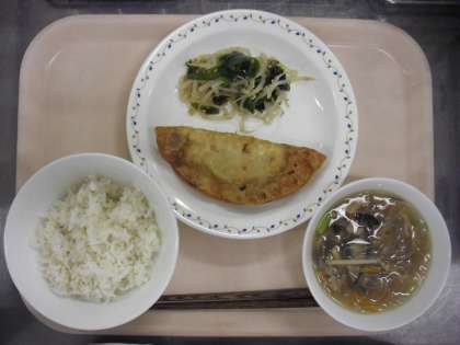 今日の「主食は麦入りごはん」「主菜はジャンボぎょうざ」「副菜はもやしとわかめのサラダ」「汁物が春雨スープ」でした。ジャンボぎょうざの材料は、「豚挽肉・しょうが・キャベツ・葱・にら・にんにく・塩・こしょう・酒・しょうゆ・ごま油」です。みんなが好きな献立のひとつです。