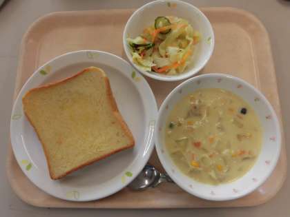 今日から1年生の給食が始まりました。初めての給食は、配膳が簡単にできるように、パンとスープ、サラダにしました。