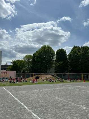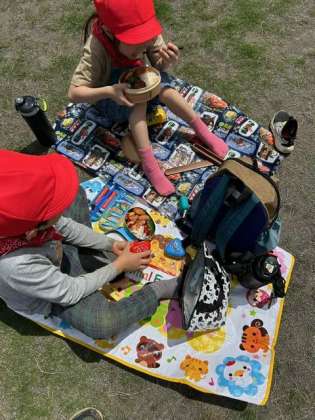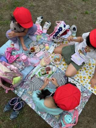 昼食の時間。帰校してから、校庭の親子山に集まって、芝生の上で美味しそうにお弁当を食べています。