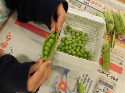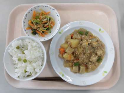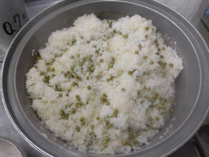 今日はこの時期旬のグリンピースを使った『グリンピースごはん』です。グリンピースのさやむきを2年生にお手伝いしてもらいました。苦手な食材の一つですが、今日は自分たちで頑張って、さやむきをしたのもあり、おいしく食べられたようです。