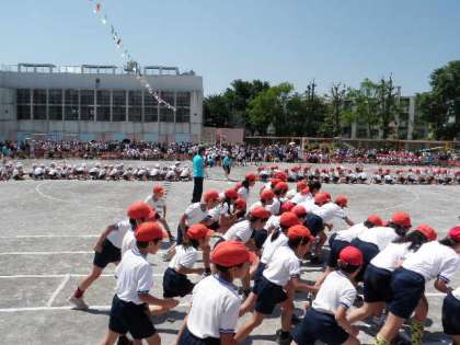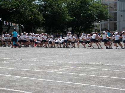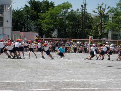 プログラムNo.6、3・4年生の団体競技「お助け綱引き」です。練習では、いつも赤が勝っていたそうですが、本番は白が頑張り勝利を収めました。