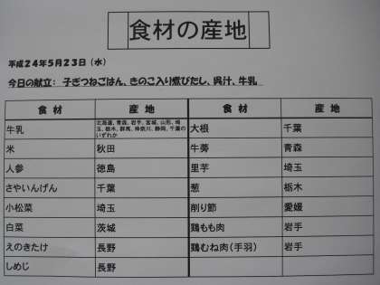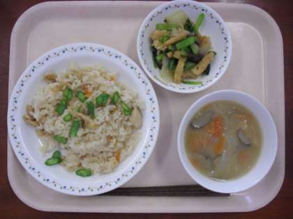 子ぎつねごはんは、油揚げが入った炊き込みごはんです。呉汁に入っている大豆は、給食室で茹でて砕いています。きのこ入り煮びたしもおいしくいただきました。