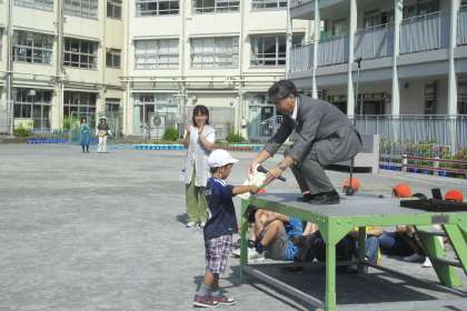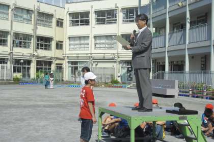 まず、表彰を行いました。「わんぱくずもう」の1年生の男子の部で準優勝した児童と少年空手で3位に入賞した児童の表彰を行いました。