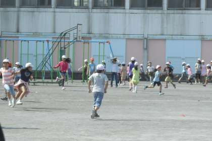 次に「ふえてく鬼」ゲームを、全校児童で行いました。校庭まいっぱいに広がって、鬼につかまらないように走り回りました。
