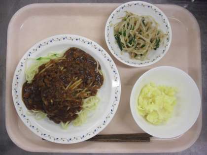 <ジャージャー麺・もやしのごま風味・じゃがバター・牛乳>