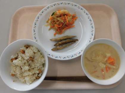 今日6月4日は「虫歯予防デー」です。健康な歯を保つことは、毎日おいしく楽しく食事をするために欠かせません。食後の歯磨きも大切ですが、よくかんで食べることも虫歯予防につながります。そこで今日は、かみごたえのある食材(揚げた豆や根菜)やカルシウム満点の小魚を献立に取り入れました。日頃から、かむことを意識して食べるようにしましょう。