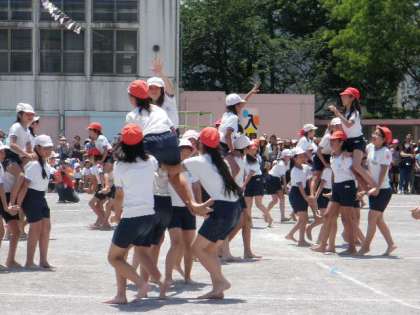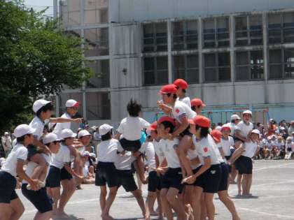 プログラムNo.12、5・6年生の「騎馬戦」です。体格ではなく、騎上に元気のいい子が乗っている騎馬が強かったですね。赤の作戦勝ちでしょうか。