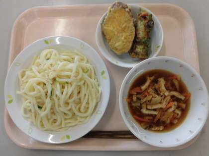 今日は暑い季節にぴったりの『冷やしうどん』にしました。めんだけでは栄養が偏ってしまうので、つけ汁には肉や野菜、かまぼこなどで具だくさんにしてあります。