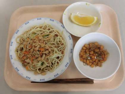 暑くなってきたので、冷やし中華にしました。具材はもやしときゅうりに、鶏肉と油揚げ、にんじんなどを煮たもので、甘酸っぱいしょうゆだれでいただきます。この時期限定のメニューになりますが、冷たい麺料理はやはり人気です。