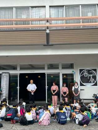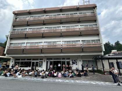 宿泊するホテル春茂登に着きました。開園式をしています。途中雷鳴も聞こえましたが、雨には降られず、暑くない天候で、ここまでのプログラムを進めています。みんな元気です。