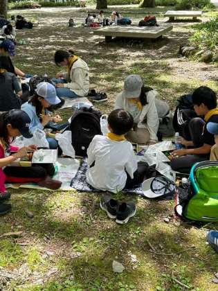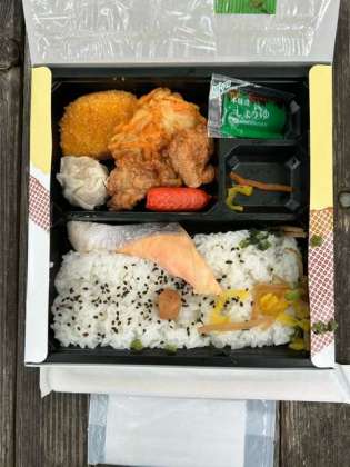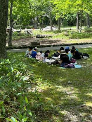 二日目のお弁当です。光徳牧場の涼しい木陰で美味しそうに食べています。