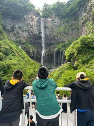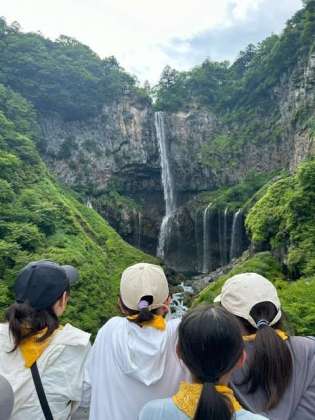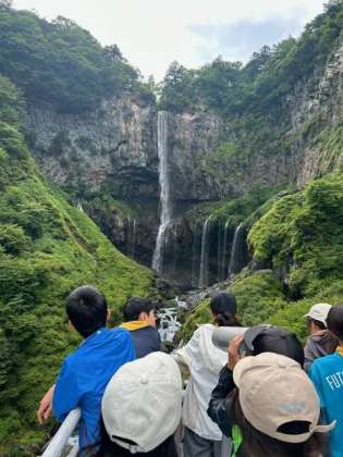 華厳ノ滝の見学をしています。もう言うことなし。雄大な姿をただ見入っています。これで二日目の外の活動を終えました。天気を気にしながらの行程でしたが、すべてのプログラムが実施でき、とてもよかったです。これからホテルに向かいます。