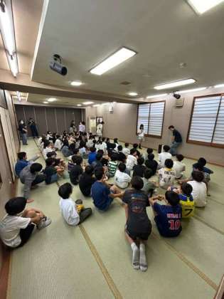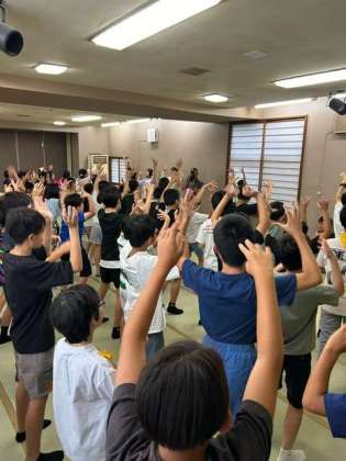 三日目の朝は曇り空です。朝会で体操をし、出発までの確認をしました。みんな元気です。