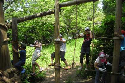 東急田園都市線すずかけ台から歩いて、10分ほどの場所にあります。様々なアスレチックがあり、グループで回りながら体を思いきり動かして、体力づくりを行いました。