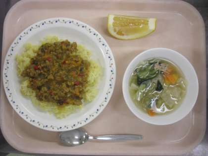 毎月給食に出てくるカレーライスですが、今月は干しぶどうの甘さと野菜の甘みがぎっしりとつまったおいしいドライカレーライスでした。美生柑も甘くておいしい果物でした。